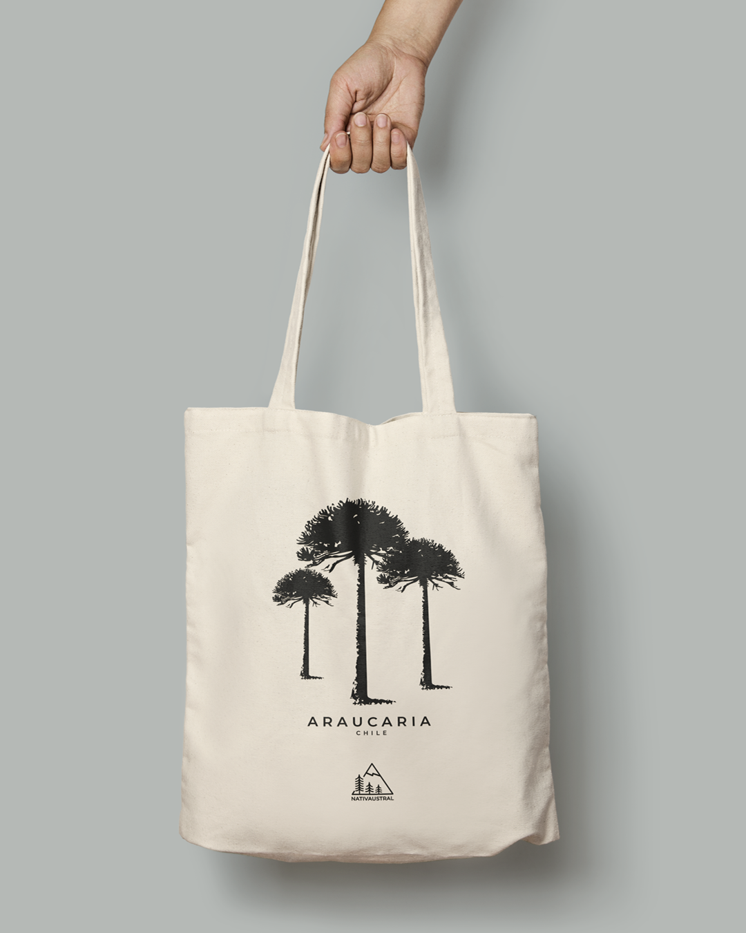 Linda y comoda totebag diseño araucaría. Cuando lleves una totebag Nativaustral estarás contribuyendo a un estilo de vida más consciente y sostenible, al incentivar la disminución del uso de plástico y el hábito de reutilizar productos.
